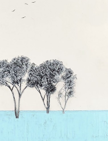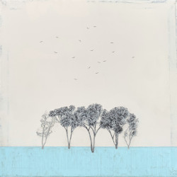 The tree, a recurring motif, emerges under her brush as a living presence, both fragile and majestic. The line is precise, the texture subtle, the background luminous. Vast spaces open up, silence is almost tangible. One senses the influence of photography, another of her passions, in her ability to distill the essential and to suggest rather than to reveal outright.
