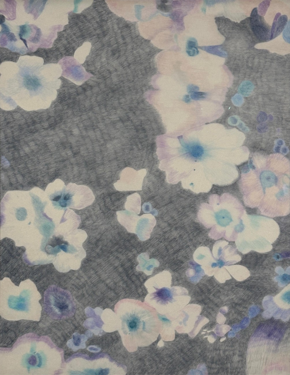 The act of drawing with colored pencil is slow and attentive; it is less about representation than about capturing, a fleeting sensation held and laid gently on the paper.