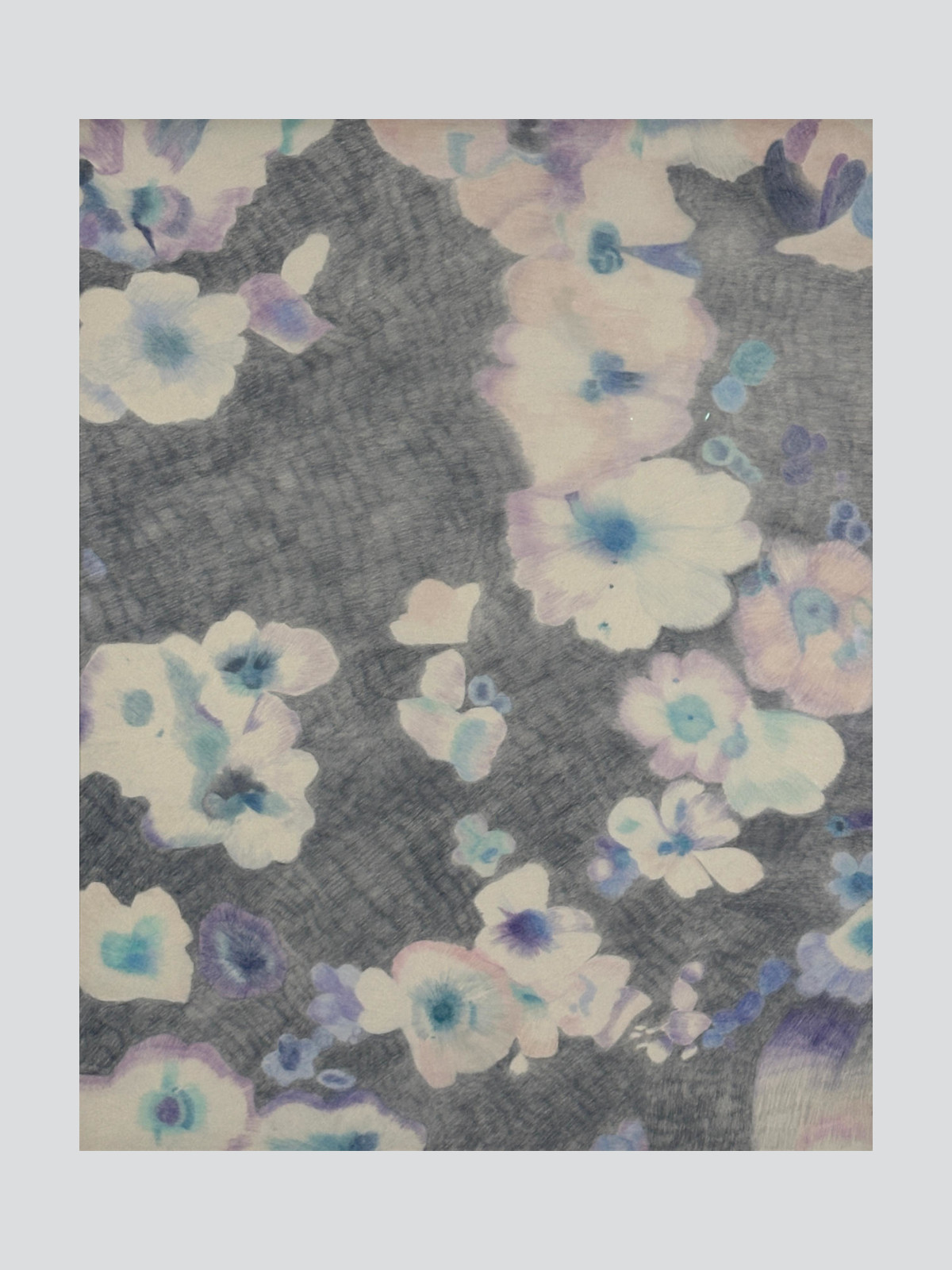 Her favored medium is colored pencil on extra-thick, velvety tracing paper (300g). Through tracing paper, she explores light not as a frontal illumination, but as a diffuse, intimate, permeating presence. Initially a tool for landscape design research, tracing paper has now become a medium for new explorations. It lets things pass through—like what is seen, and sometimes what traverses us. Her drawing inhabits this in-between.