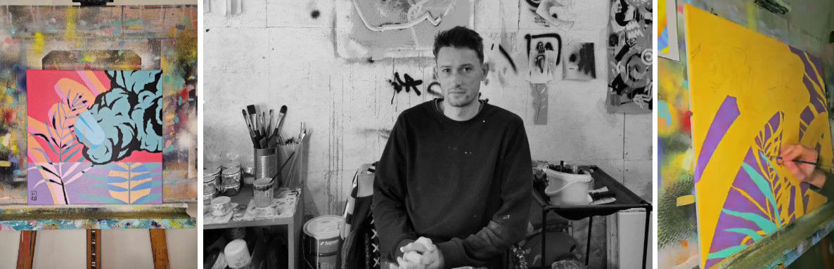 Issu de la culture graffiti, du skate et du hip hop, il a construit son univers en marge des écoles et dans l’expérimentation libre. La peinture s’impose à lui comme médium essentiel, un langage plastique où il explore la rencontre entre l’humain et la nature, entre la force des éléments et le mouvement intérieur.