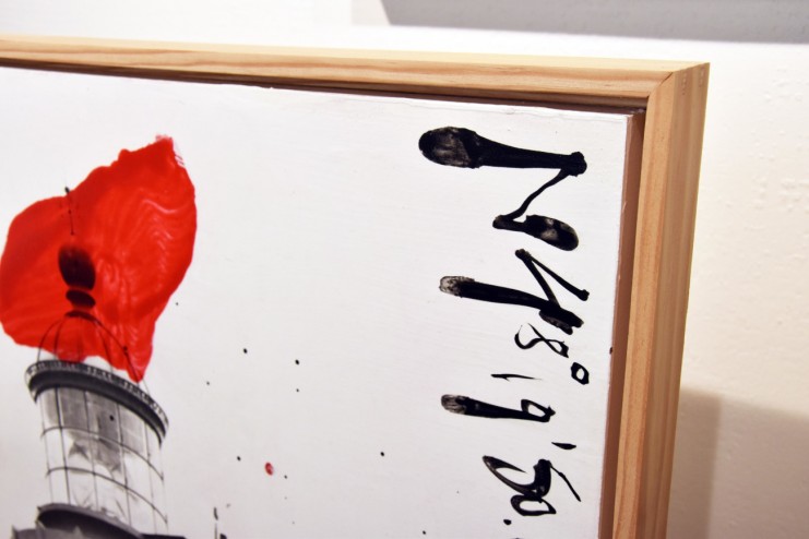 Technique mixte, collages, photo et peinture acrylique sur bois, rehaussé à l'encre de Chine + cadre