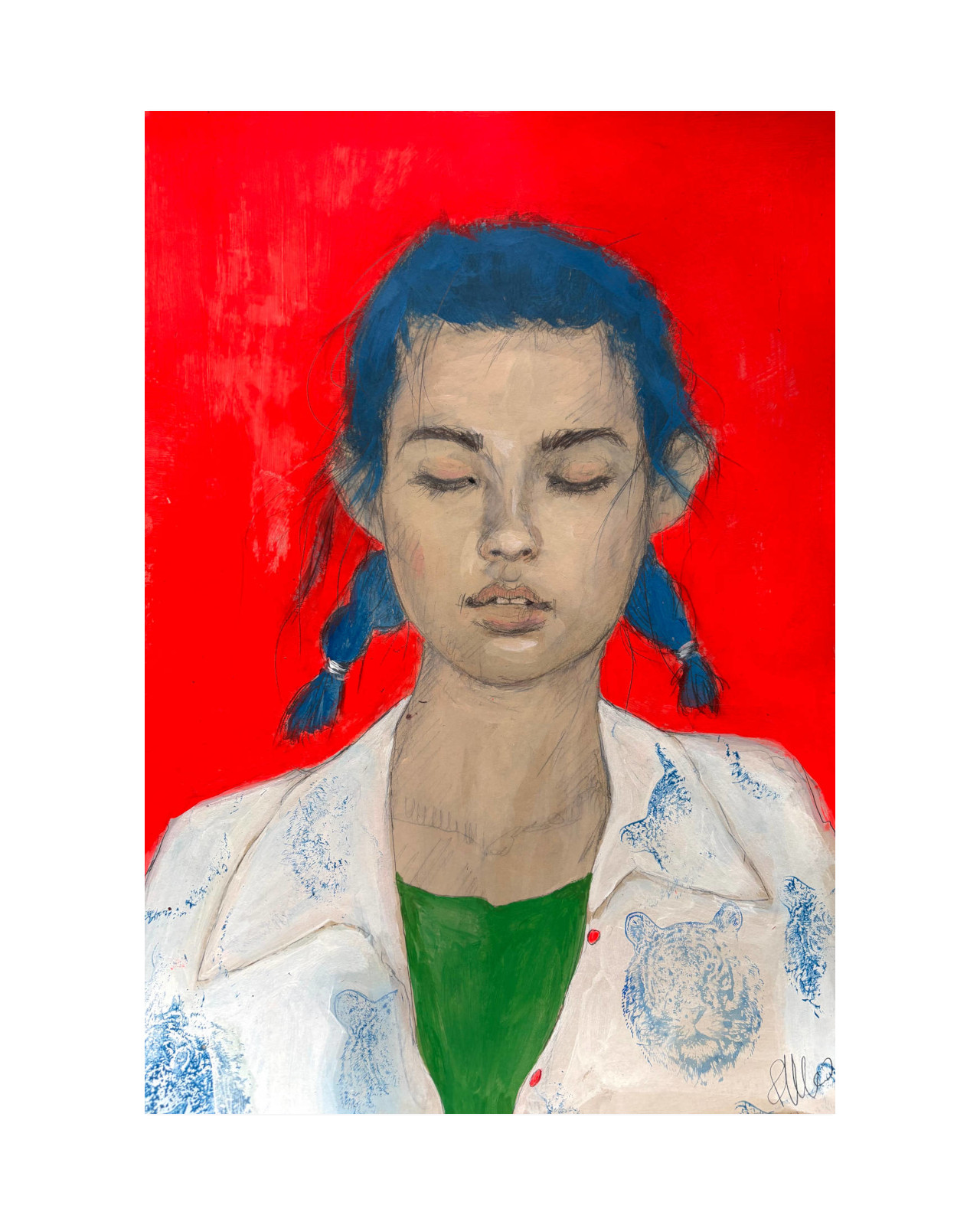 Ses oeuvres d'art sont la représentation de portraits féminins comme des icônes de notre société contemporaine où le corps et l'image de la femme s'émanciperaient des stéréotypes pour retrouver sa force et son caractère premier. Des tatouages, des marques, des symboles sont présents aussi bien pour accentuer cette recherche d'une beauté presque primitive, que comme la marque de notre société contemporaine. Les tatouages apparaissent comme des armures de peau.