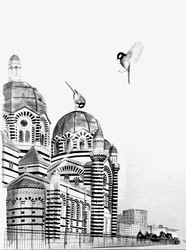 Et au cœur de ce monde animal qui l’inspire tant, une espèce en particulier tire son épingle du jeu. Dans ses vues de Marseille à l’encre, elle capte un lieu, son essence, ce qui en fait l’identité et comme une représentation d’elle-même, elle place une mésange dont la taille disproportionnée rend l’image poétique, irréelle. Cette mésange est un symbole de liberté, de légèreté, de simplicité. Elle rend la ville exceptionnelle, et met en valeur ces lieux que nous avons tendance à voir sans les regarder, elle leur donne une dimension nouvelle. Elle les isole de leur environnement habituel pour les remettre au centre, nous pousser à porter une attention toute neuve dessus. Elle fait aussi voler cette mésange dans d’autres villes, d’autres lieux, mais c’est surtout Marseille, la ville vivante, la cité phocéenne, qui l’attire. Et malgré le noir et blanc, nous percevons sa chaleur, le soleil, les nuances, son ambiance si particulière.
