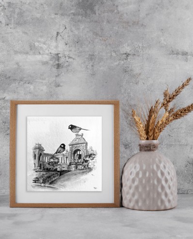 Et au cœur de ce monde animal qui l’inspire tant, une espèce en particulier tire son épingle du jeu. Dans ses vues de Marseille à l’encre, elle capte un lieu, son essence, ce qui en fait l’identité et comme une représentation d’elle-même, elle place une mésange dont la taille disproportionnée rend l’image poétique, irréelle. Cette mésange est un symbole de liberté, de légèreté, de simplicité. Elle rend la ville exceptionnelle, et met en valeur ces lieux que nous avons tendance à voir sans les regarder, elle leur donne une dimension nouvelle. Elle les isole de leur environnement habituel pour les remettre au centre, nous pousser à porter une attention toute neuve dessus. Elle fait aussi voler cette mésange dans d’autres villes, d’autres lieux, mais c’est surtout Marseille, la ville vivante, la cité phocéenne, qui l’attire. Et malgré le noir et blanc, nous percevons sa chaleur, le soleil, les nuances, son ambiance si particulière.
