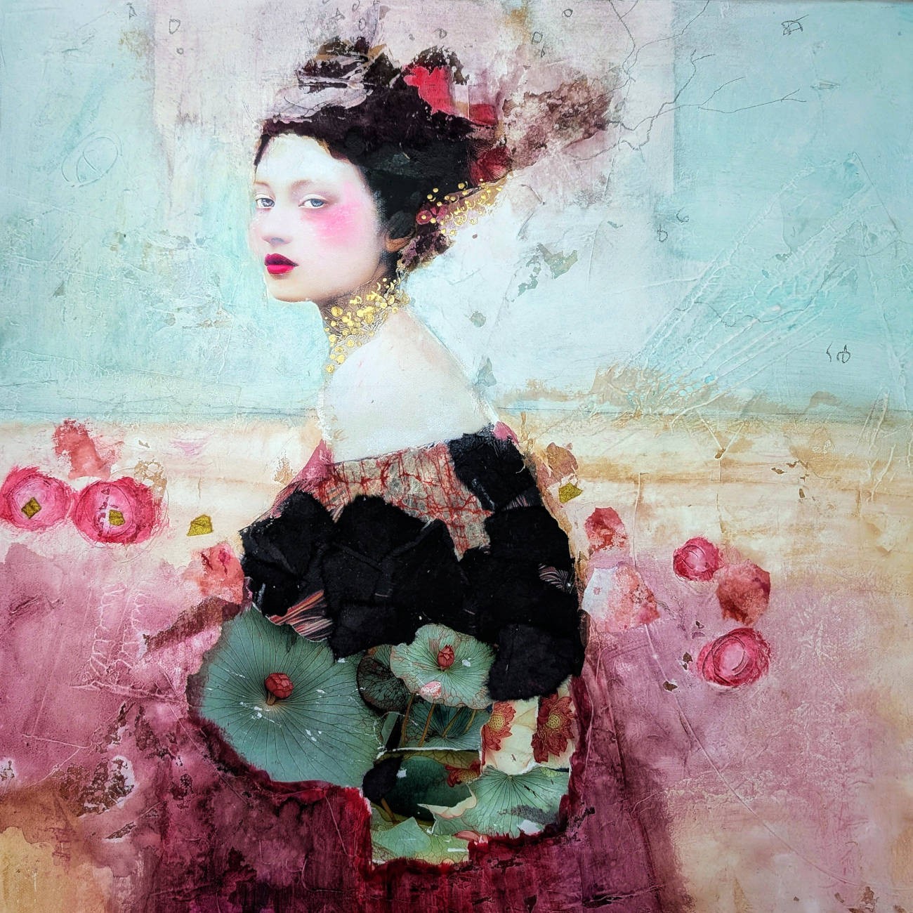 Inspirée par la sensualité dorée de Gustav Klimt, la grâce diaphane de Marie Laurencin et l'élégance épurée de l'art japonais, je travaille à l'acrylique très diluée, en explorant également les techniques mixtes. J’intègre à mes créations des collages de papiers, de photographies et de papiers japonais, pour enrichir les textures et les résonances poétiques de mes compositions.