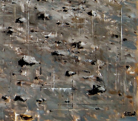 Mes toiles « vu du ciel » sont élaborées à partir de photographies issues de satellites d'observation ou de web-cams. J'ai toujours porté un intérêt particulier à la géographie, les cartes et les atlas. C'est donc très naturellement que je collecte ces images sur le web, là où elles se développent et pullulent par milliards. Elles me servent à ébaucher la structure de mes tableaux et à en donner la tonalité d'ensemble. Ensuite mon travail consiste à interpréter librement ces photographies, à digérer leur froideur et leur inhumanité et à mettre en lumière leurs évidences et leurs paradoxes. Par le biais de l'épaisseur de la peinture et le jeu de la couleur, je leur attribue une matérialité qu'elles ne possèdent pas. J'aime également jouer avec leur échelle, ce qui me permet de mettre en œuvre petits et grands formats, de confronter vides et pleins, et d'avancer sur la frontière nébuleuse; figuration/abstraction.