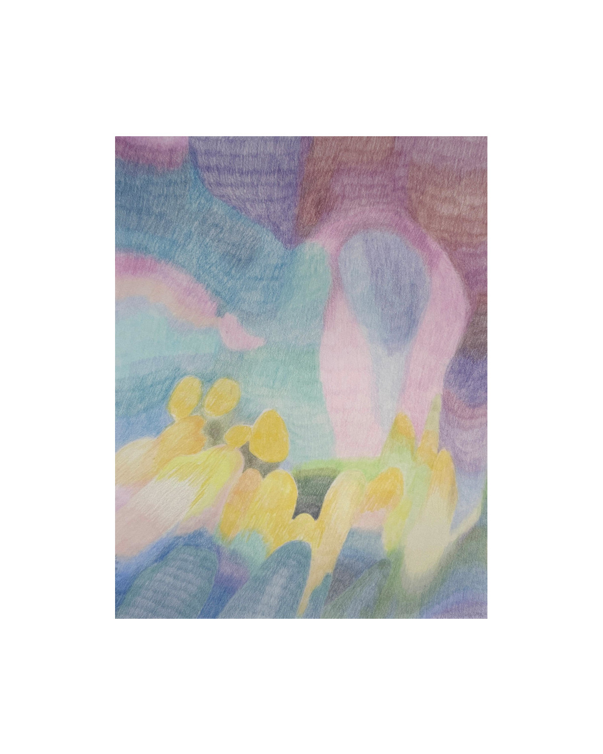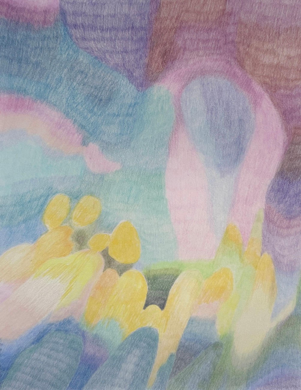 Le geste du dessin au crayon de couleurs est lent et attentif, il s'agit moins de représenter que de capter, une sensation fugace retenue et posée sur le papier.