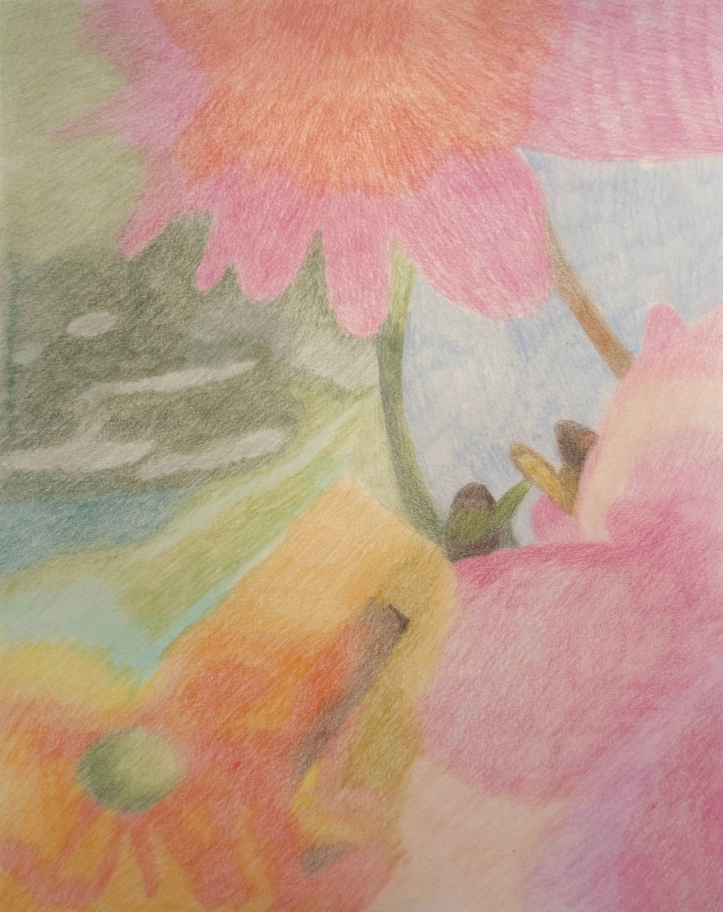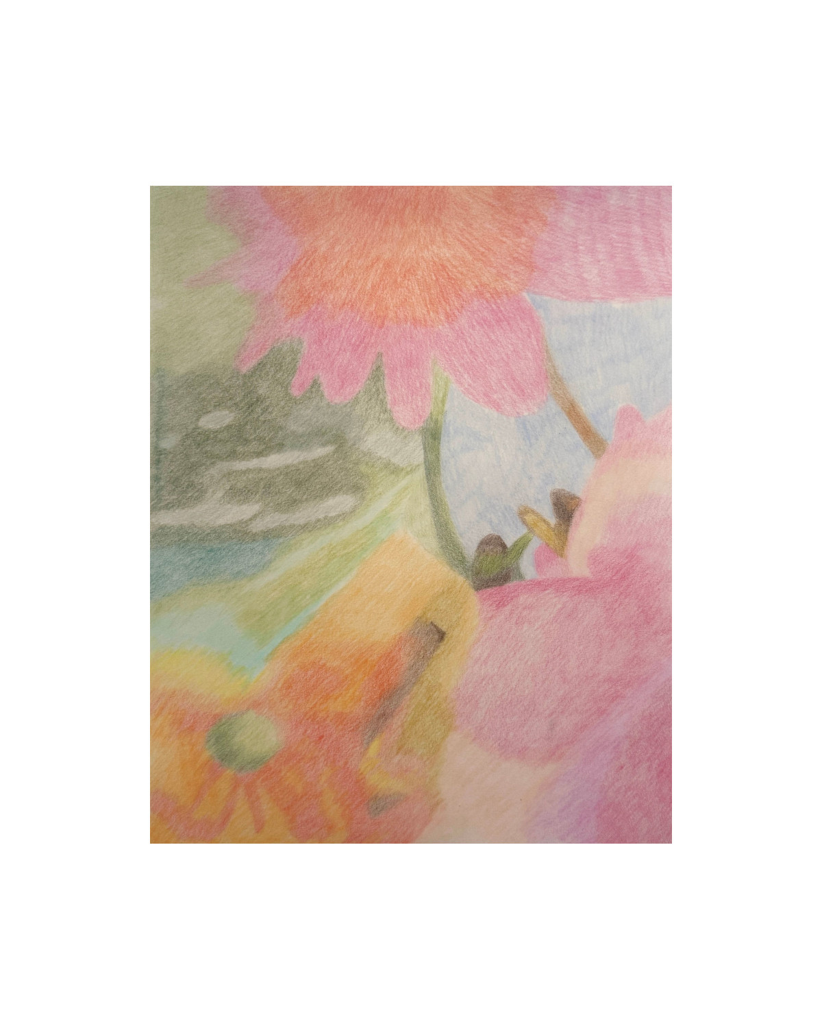 Le geste du dessin au crayon de couleurs est lent et attentif, il s'agit moins de représenter que de capter, une sensation fugace retenue et posée sur le papier.